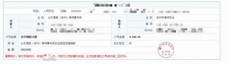 本所各位律師工作人員積極響應(yīng)號(hào)召,2000元、1000元、500元、300等等,根據(jù)個(gè)人不同情況,紛紛獻(xiàn)出愛心,倡議發(fā)出僅一天時(shí)間,就募集資金9800元。善款收齊后,由律所統(tǒng)一交濱州市律師協(xié)會(huì)代為捐贈(zèng)。